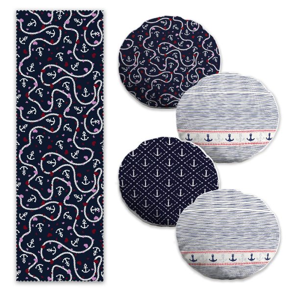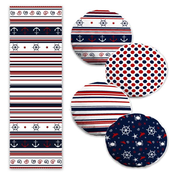Çapa Motifli Denizci Tasarımlı 4 Yuvarlak Kırlent Kılıfı ve 1 Runner Seti