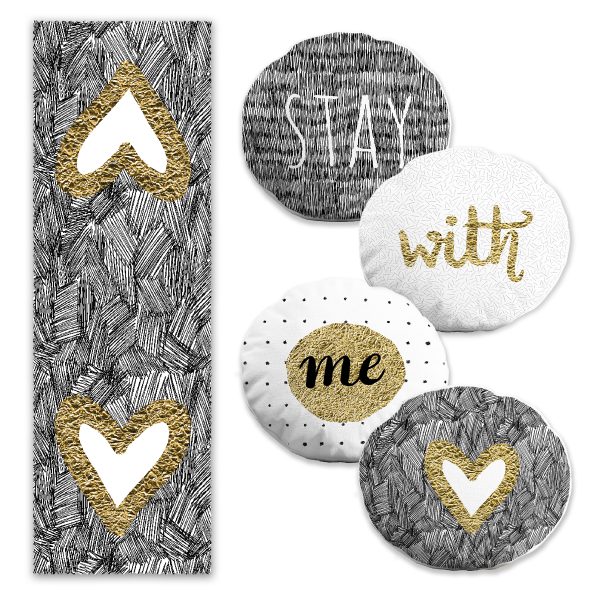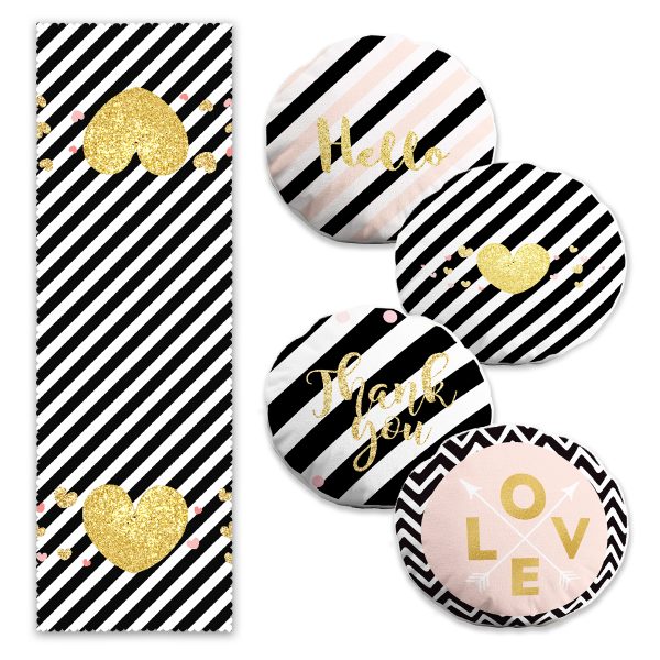 Siyah Beyaz Çizgi Zeminli Aşk Temalı 4 Yuvarlak Kırlent Kılıfı ve 1 Runner Seti
