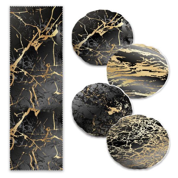 Siyah Altın Varaklı Mermer Motifli 4 Yuvarlak Kırlent Kılıfı ve 1 Runner Seti