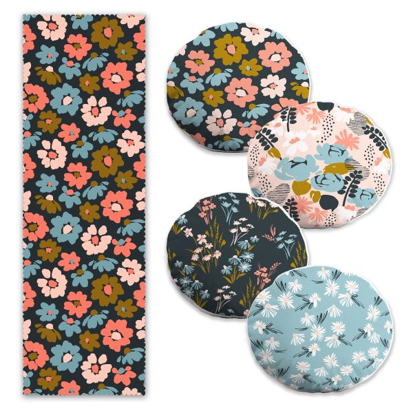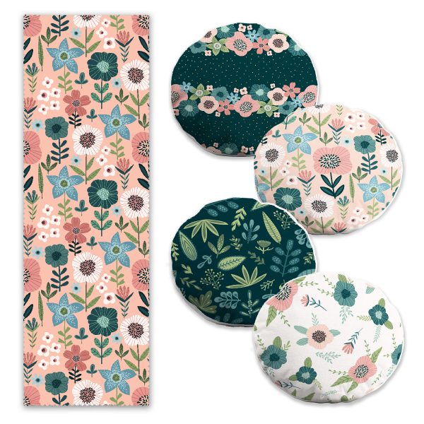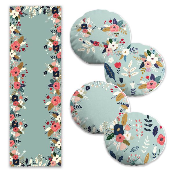 Soyut Çiçek Tasarımlı 4 Yuvarlak Kırlent Kılıfı ve 1 Runner Seti