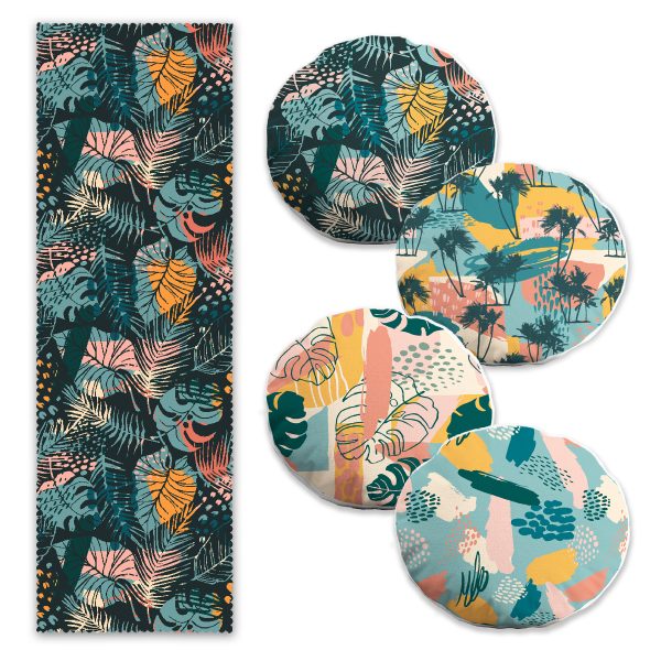 Soyut Renkli Tropik Yaprak Çizimli 4 Yuvarlak Kırlent Kılıfı ve 1 Runner Seti
