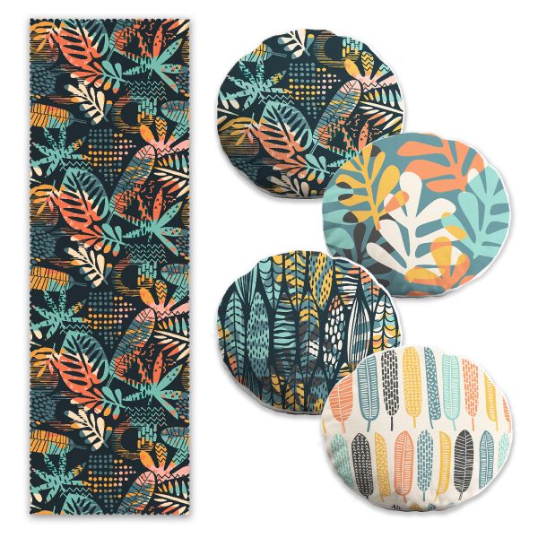 Renkli Egzotik Yaprak Tasarımlı 4 Yuvarlak Kırlent Kılıfı ve 1 Runner Seti