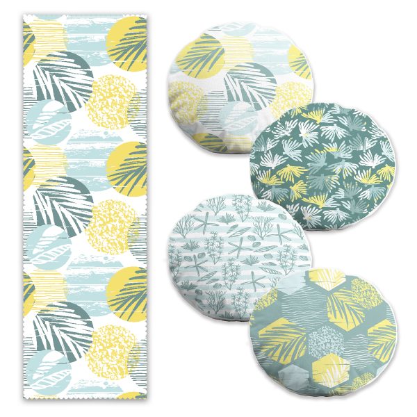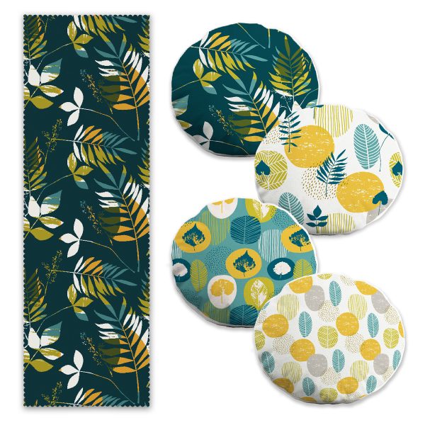 Tropik Yaprak Motifli 4 Yuvarlak Kırlent Kılıfı ve 1 Runner Seti