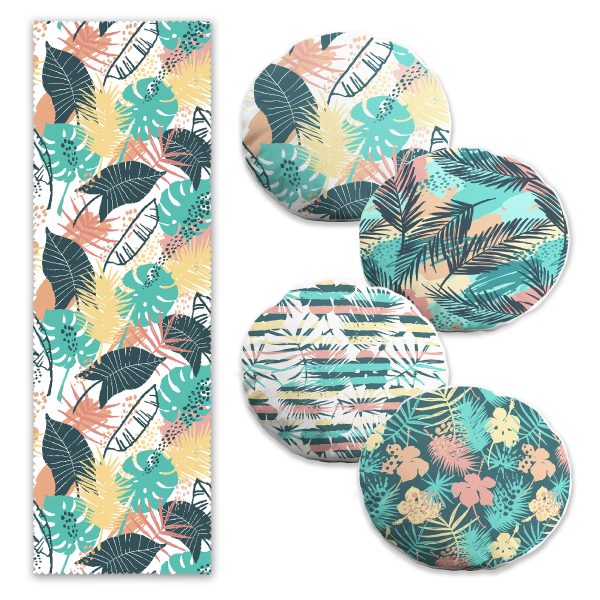 Renkli Tropik Yaprak Motifli 4 Yuvarlak Kırlent Kılıfı ve 1 Runner Seti