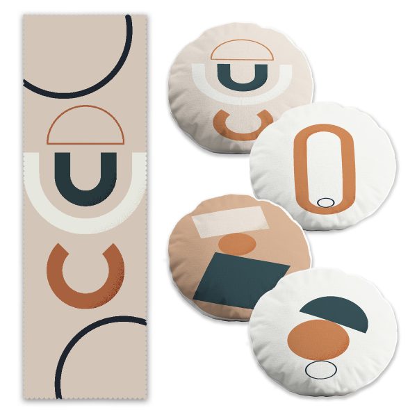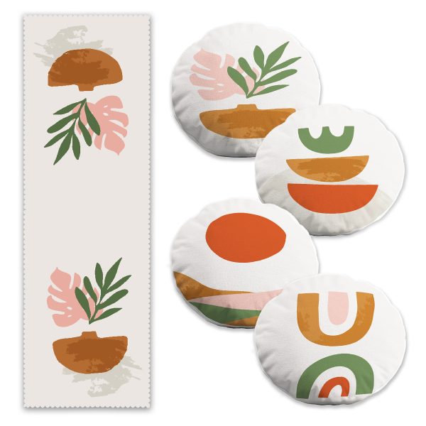 Soyut Tasarımlı 4 Yuvarlak Kırlent Kılıfı ve 1 Runner Seti