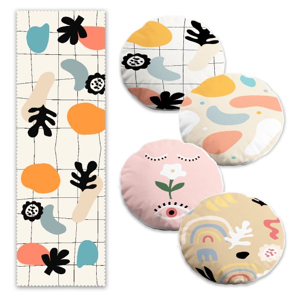 Soyut Renkli Çizimli 4 Yuvarlak Kırlent Kılıfı ve 1 Runner Seti