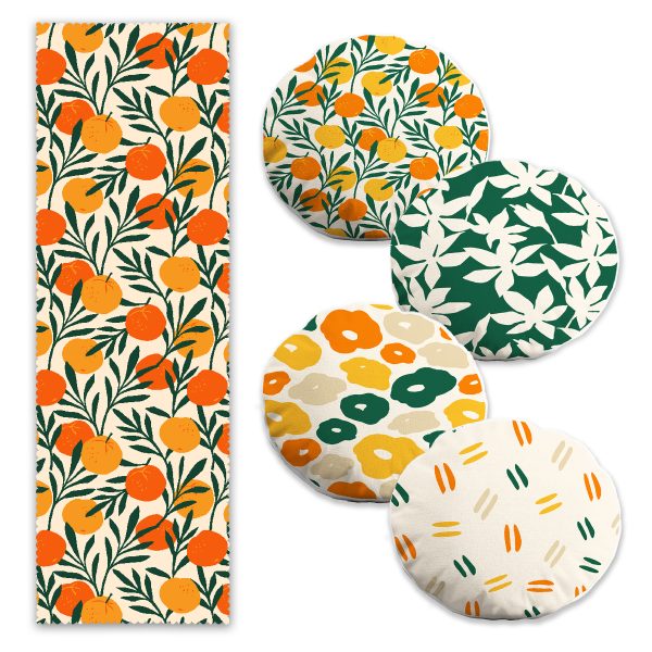 Krem Zeminli Portakal Tasarımlı 4 Yuvarlak Kırlent Kılıfı ve 1 Runner Seti
