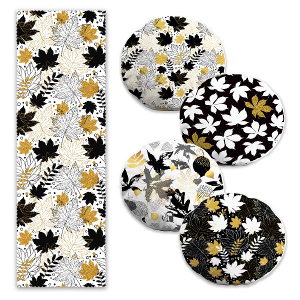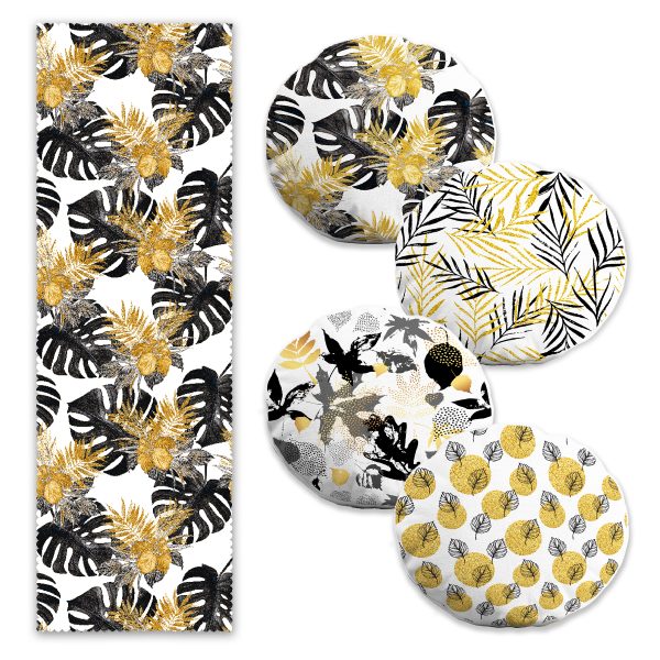 Siyah Beyaz & Altın Varaklı Tropik Yaprak Motifli 4 Yuvarlak Kırlent Kılıfı ve 1 Runner Seti