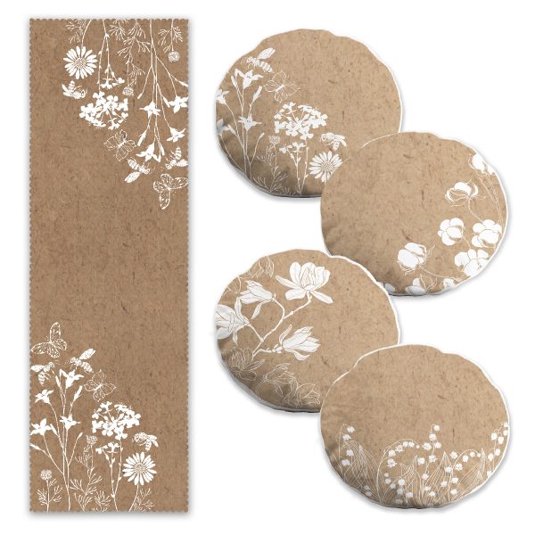 Kahverengi Zeminli Çiçek Tasarımlı 4 Yuvarlak Kırlent Kılıfı ve 1 Runner Seti