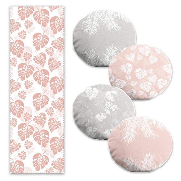 Pembe Tropik Yaprak Tasarımlı 4 Yuvarlak Kırlent Kılıfı ve 1 Runner Seti