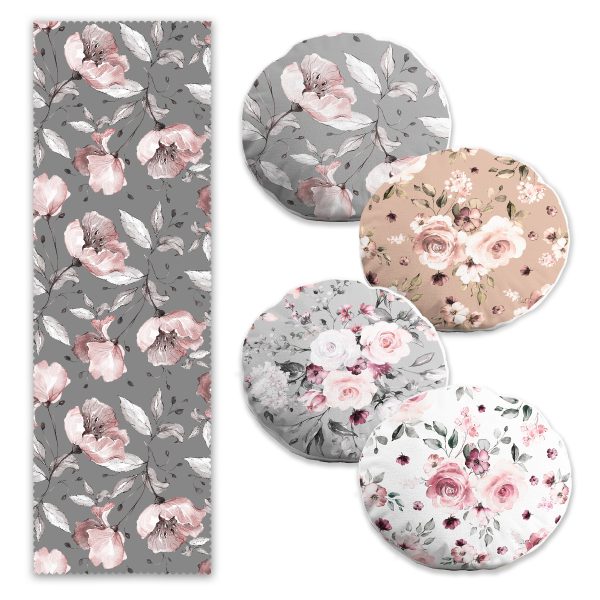 Gri Zeminli Gül Motifli 4 Yuvarlak Kırlent Kılıfı ve 1 Runner Seti