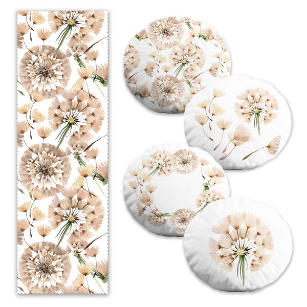 Suluboya Çizimli Karahindiba Tasarımlı 4 Yuvarlak Kırlent Kılıfı ve 1 Runner Seti