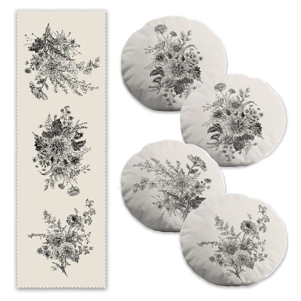Krem Zeminli Karakalem Çiçek Demeti Motifli 4 Yuvarlak Kırlent Kılıfı ve 1 Runner Seti