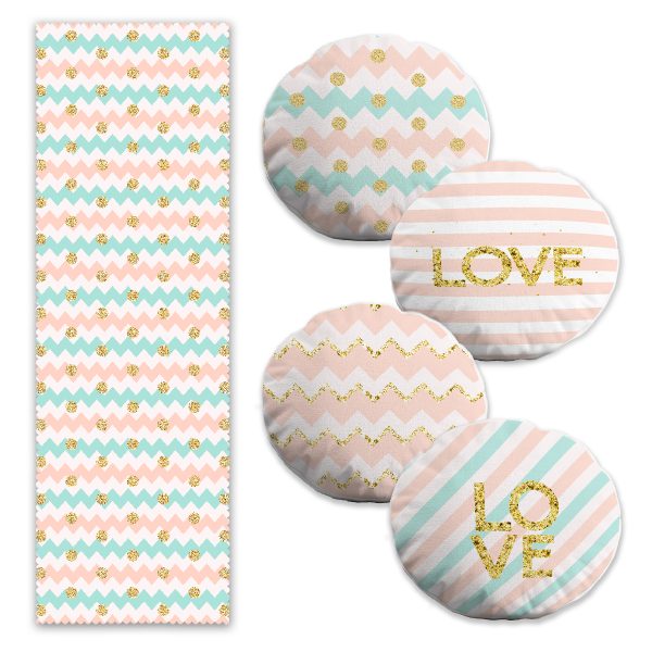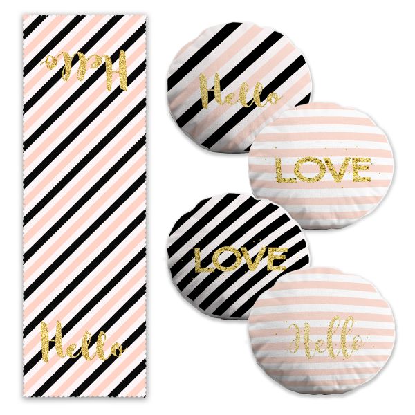 Hello & Love Tasarımlı 4 Yuvarlak Kırlent Kılıfı ve 1 Runner Seti