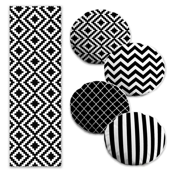 Siyah Beyaz Geometrik Çizimler Tasarımlı 4 Yuvarlak Kırlent Kılıfı ve 1 Runner Seti