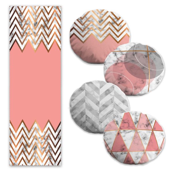 Pembe & Altın Varaklı Motifler Çizimli 4 Yuvarlak Kırlent Kılıfı ve 1 Runner Seti