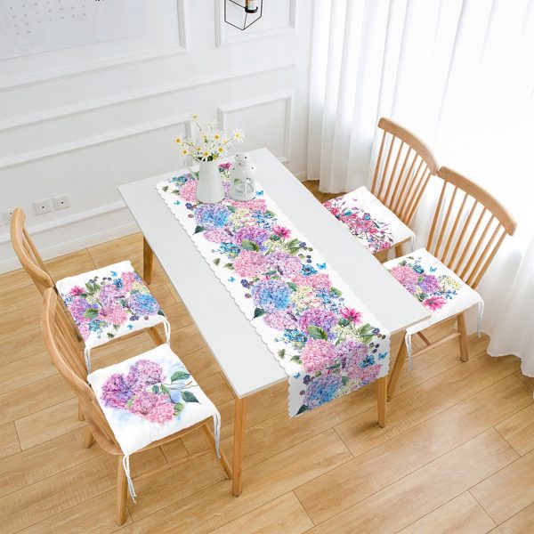 Ortanca Çiçek Motifli 4 Pofuduk Sandalye Minderi ve 1 Runner Seti