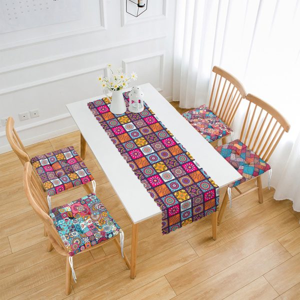Bohem Tasarımlı Dijital Baskılı 4 Yuvarlak Pofuduk Sandalye Minderi ve 1 Runner Seti