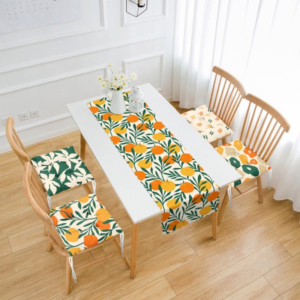 Krem Zeminli Portakal Tasarımlı 4 Pofuduk Sandalye Minderi ve 1 Runner Seti