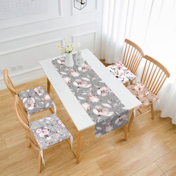 Gri Zeminli Gül Motifli 4 Pofuduk Sandalye Minderi ve 1 Runner Seti