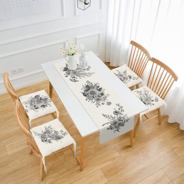 Krem Zeminli Karakalem Çiçek Demeti Motifli 4 Pofuduk Sandalye Minderi ve 1 Runner Seti