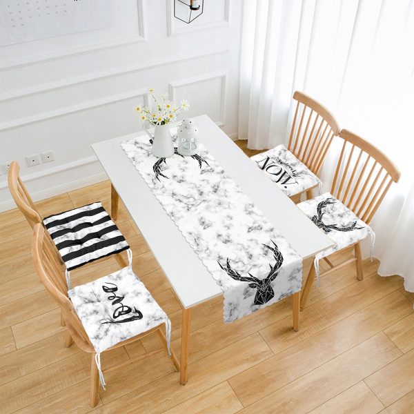 Mermer Zemin Siyah Özel Tasarımlı 4 Pofuduk Sandalye Minderi ve 1 Runner Seti