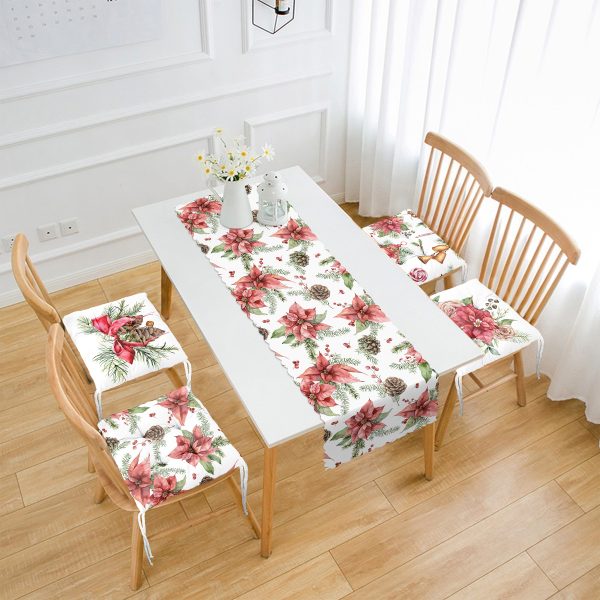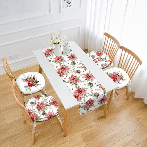 Kırmızı Beyaz Geyik Desenli Yılbaşı Motifli 4 Pofuduk Sandalye Minderi ve 1 Runner Seti
