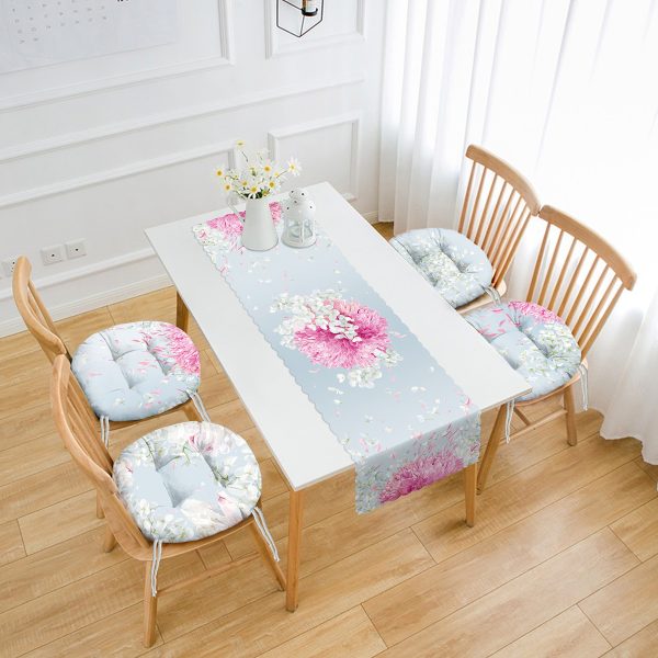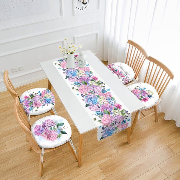 Ortanca Çiçek Motifli 4 Yuvarlak Pofuduk Sandalye Minderi ve 1 Runner Seti