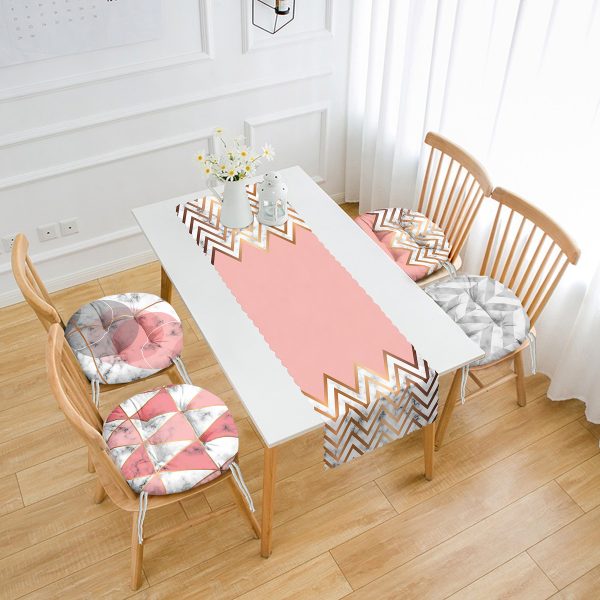 Pembe & Altın Varaklı Motifler Çizimli 4 Yuvarlak Pofuduk Sandalye Minderi ve 1 Runner Seti