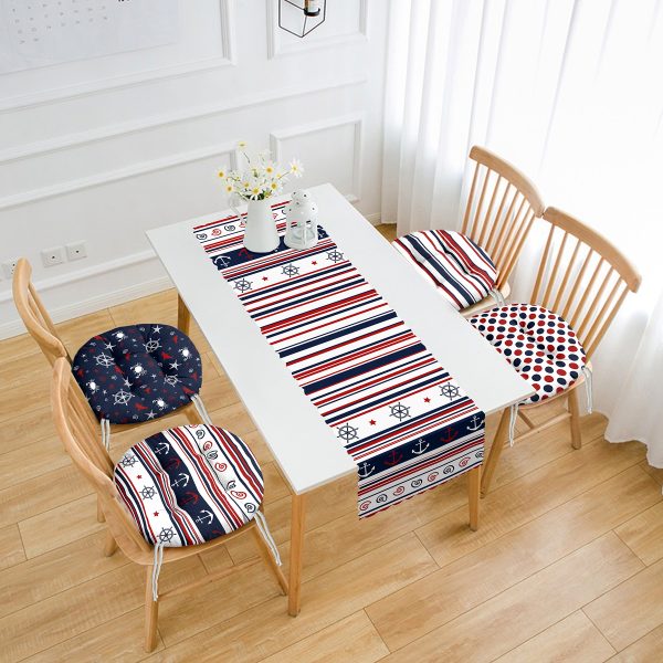 Bordo Lacivert Denizci Tasarımlı 4 Yuvarlak Pofuduk Sandalye Minderi ve 1 Runner Seti