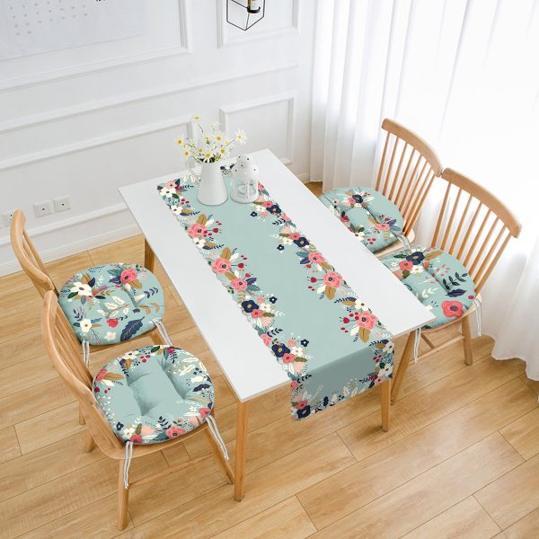Mavi Zemin Ortanca Çiçeği Tasarımlı 4 Yuvarlak Pofuduk Sandalye Minderi ve 1 Runner Seti