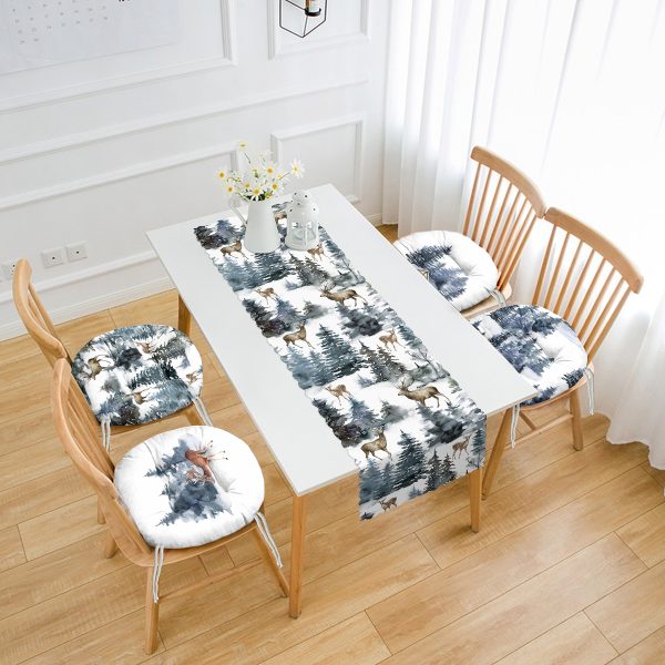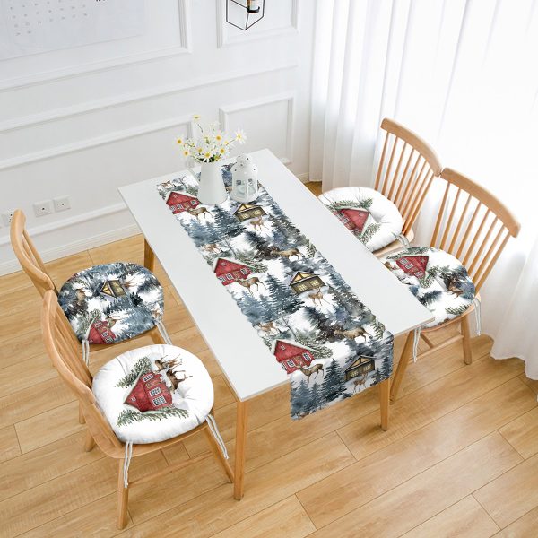 Kış Temalı Geyik Detaylı Bağ Evi Konseptli 4 Pofuduk Sandalye Minderi ve 1 Runner Seti