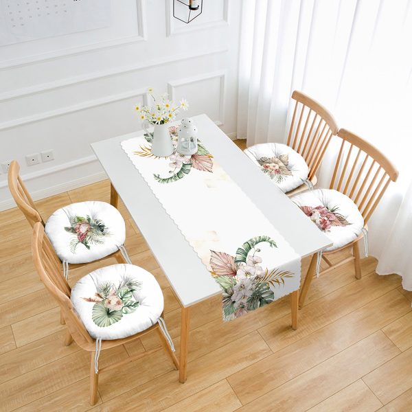 Kurumuş Tropik Yaprak Motifli 4 Yuvarlak Pofuduk Sandalye Minderi ve 1 Runner Seti