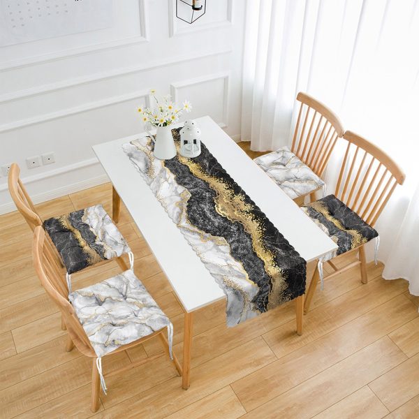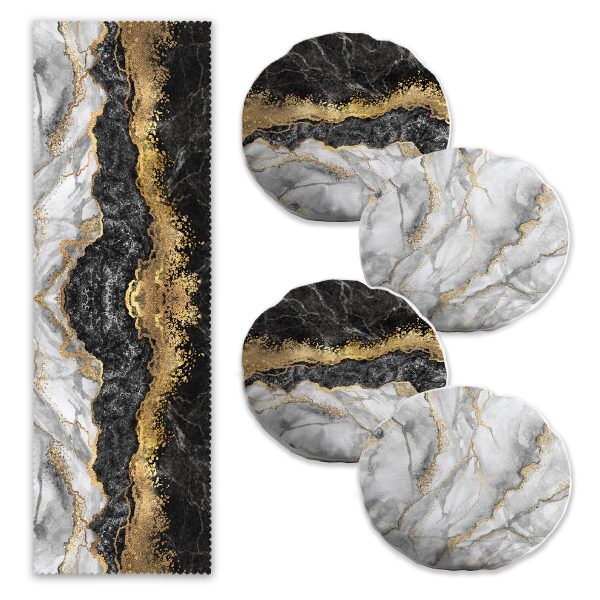 Siyah Mermer Motifli 4 Pofuduk Sandalye Minderi ve 1 Runner Seti