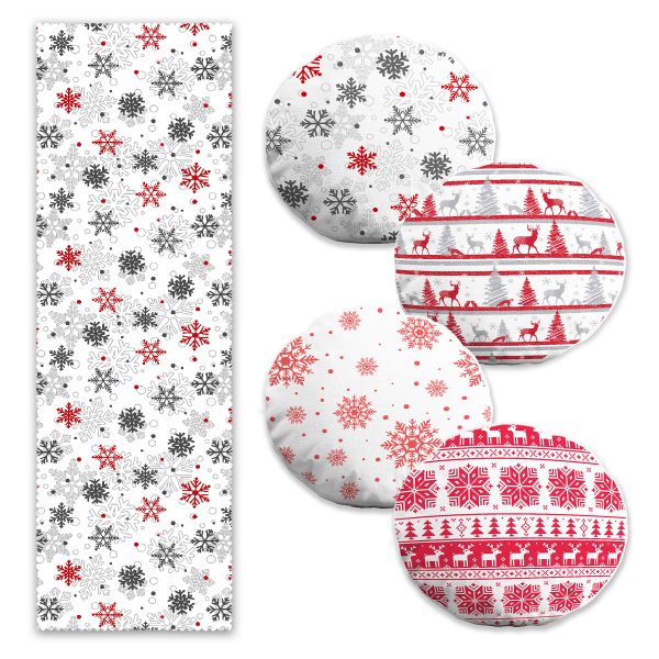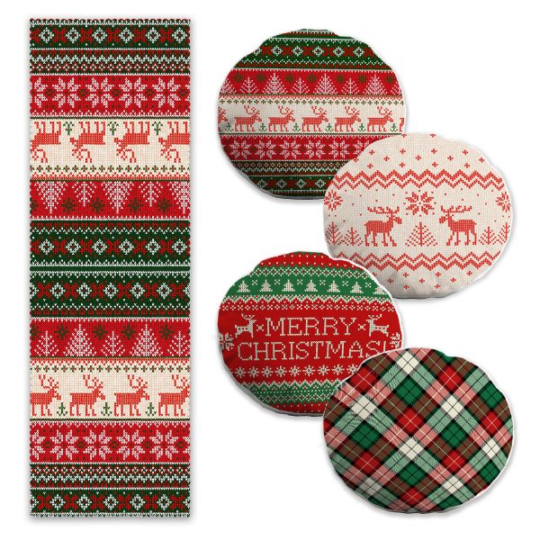 Ekose Geyik Yılbaşı Motifli 4 Yuvarlak Kırlent Kılıfı ve 1 Runner Seti