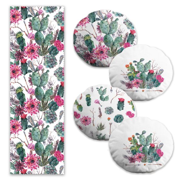 Kaktüs Motifli 4 Yuvarlak Kırlent Kılıfı ve 1 Runner Seti