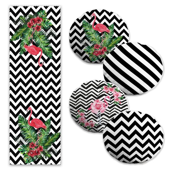 Zizag Zeminli Flamingo Tasarımlı 4 Yuvarlak Kırlent Kılıfı ve 1 Runner Seti