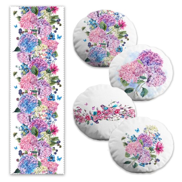 Ortanca Çiçek Motifli 4 Yuvarlak Kırlent Kılıfı ve 1 Runner Seti