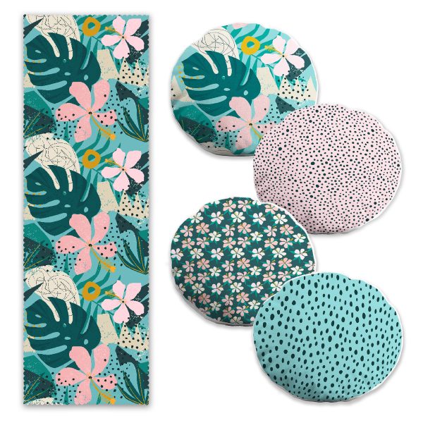 Soyut Renkli Gül Motifli 4 Yuvarlak Kırlent Kılıfı ve Runner Seti