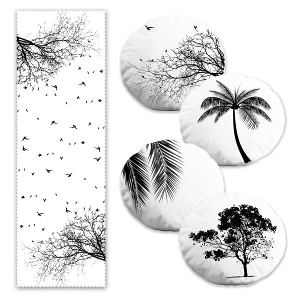 Siyah Beyaz Ağaç Tasarımlı 4 Yuvarlak Kırlent Kılıfı ve 1 Runner Seti