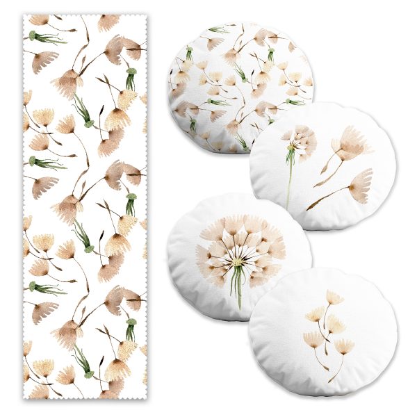 Suluboya Çizimli Karahindiba Tasarımlı 4 Yuvarlak Kırlent Kılıfı ve 1 Runner Seti