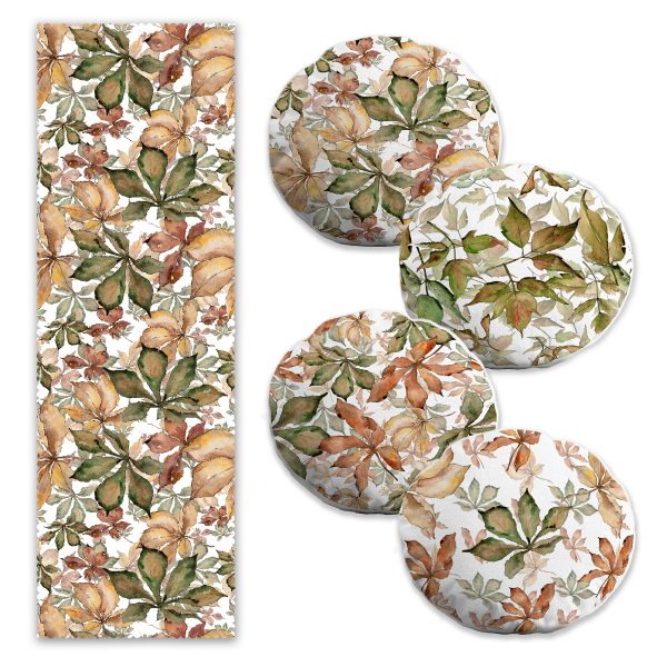 Sonbahar Temalı Yaprak Tasarımlı 4 Yuvarlak Pofuduk Sandalye Minderi ve 1 Runner Seti