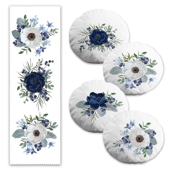 Mavi & Beyaz Gül Özel Tasarım 4 Yuvarlak Kırlent 1 Runner Seti