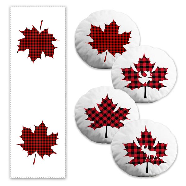 Beyaz Zemin Kırmızı Ekose Yaprak Tasarımlı 4 Yuvarlak Kırlent 1 Runner Seti