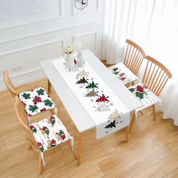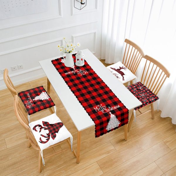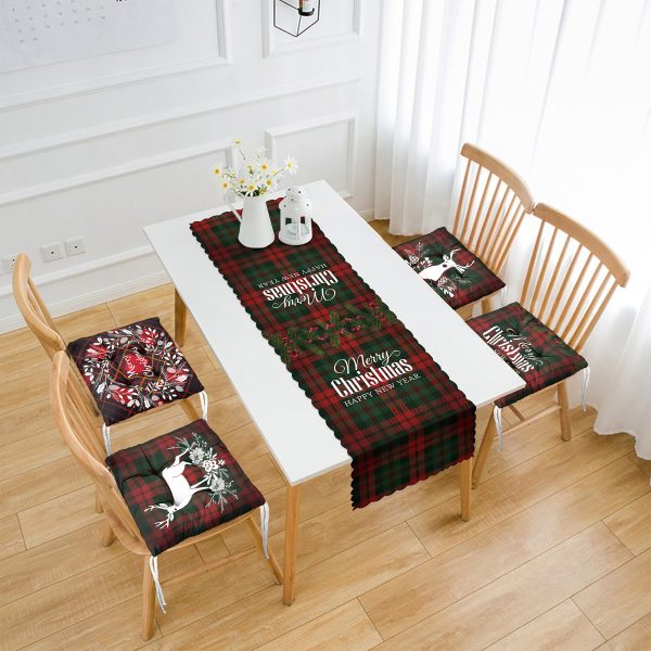 Yılbaşı Temalı Ekose Çam Ağaç Tasarımlı 4 Pofuduk Sandalye Minderi ve 1 Runner Seti
