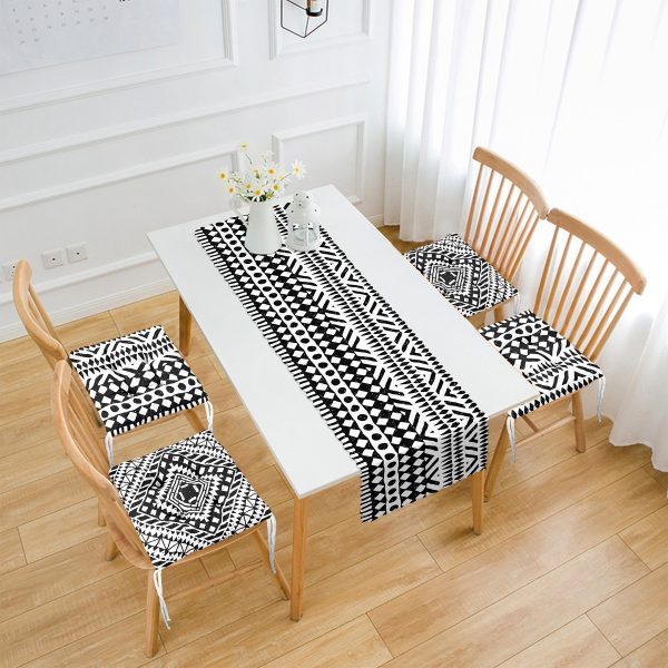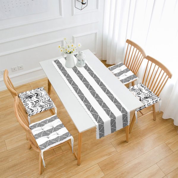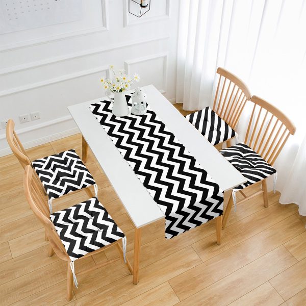 Siyah Beyaz Geometrik Tasarımlı 4 Pofuduk Sandalye Minderi ve 1 Runner Seti