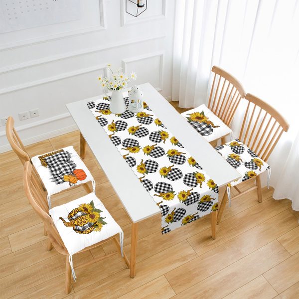 Siyah Ekose Kabak Ayçiçeği Motifli 4 Pofuduk Sandalye Minderi ve 1 Runner Seti