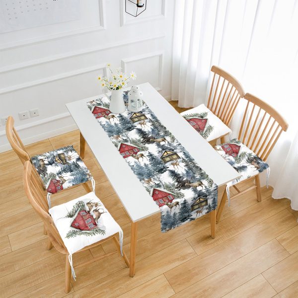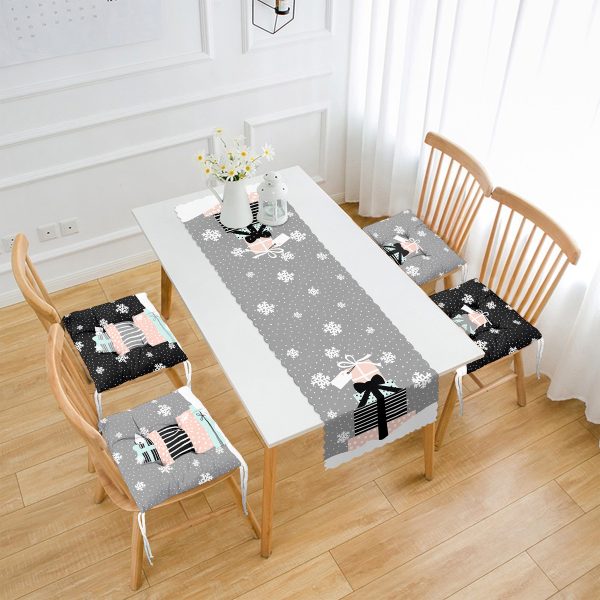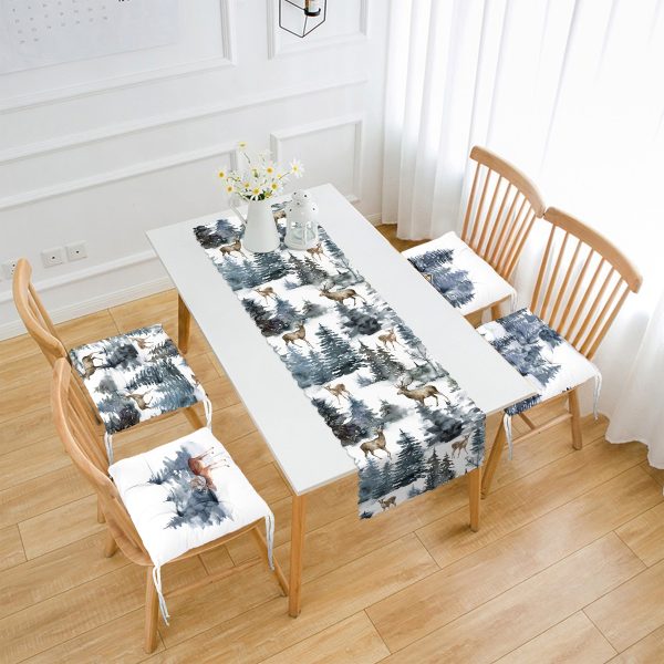 Yılbaşı Geyik Motifli Özel Tasarım 4 Pofuduk Sandalye Minderi ve 1 Runner Seti