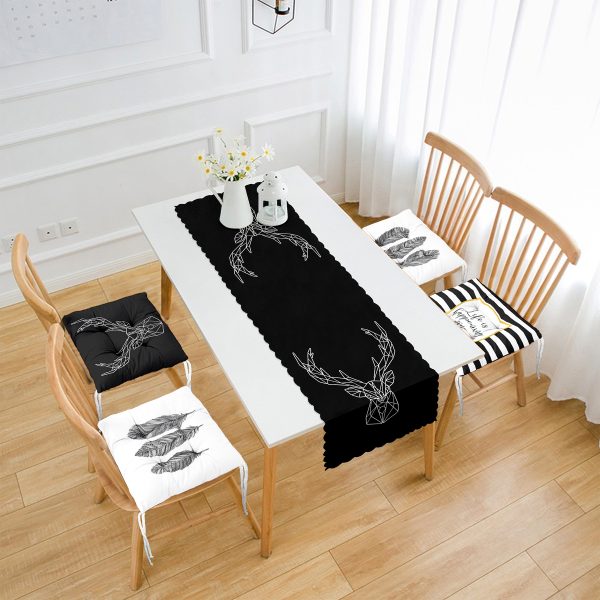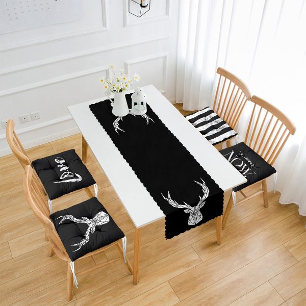 Siyah Zemin Geyik & Tüy Tasarımlı 4 Pofuduk Sandalye Minderi ve 1 Runner Seti