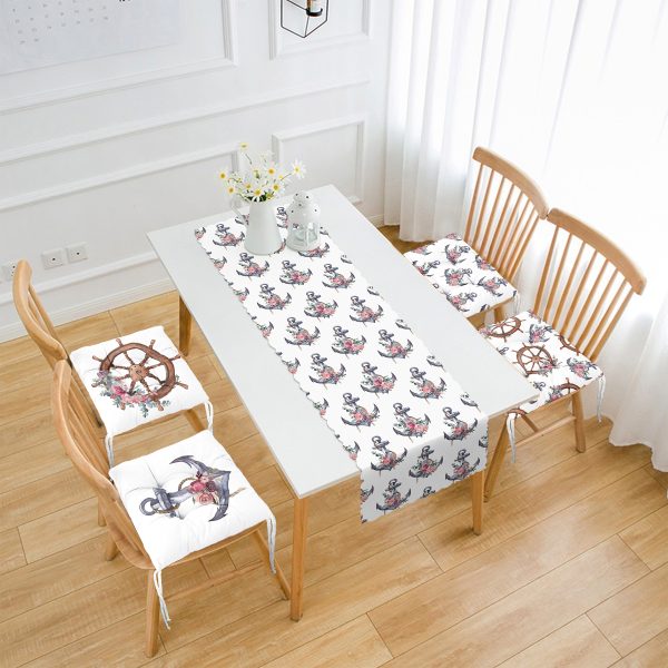 Gül Detaylı Çapa & Dümen Tasarımlı Denizci Motifli 4 Pofuduk Sandalye Minderi ve 1 Runner Seti